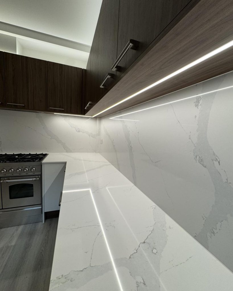 LED under-cabinet and feature lighting to add warmth and depth to the space