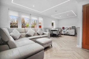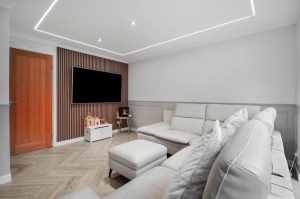 • A feature ceiling with integrated LED strip lighting, adding depth and atmosphere